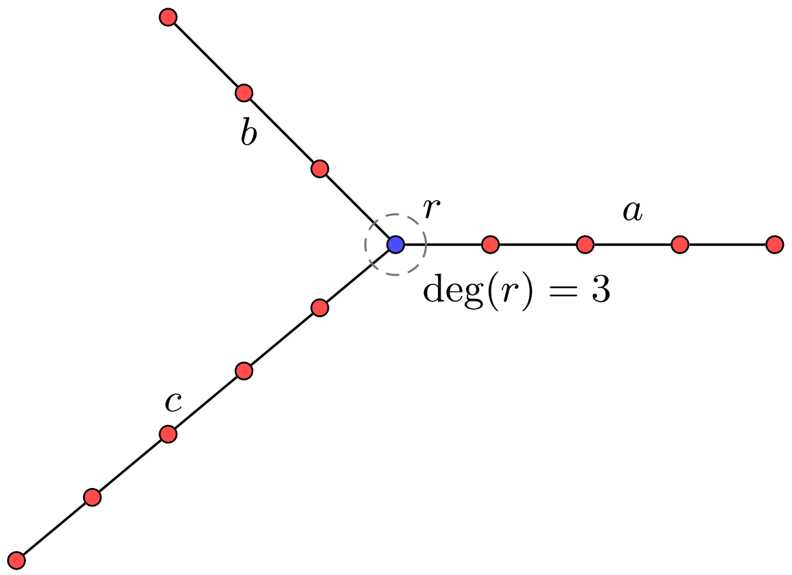 three internally disjoint paths (legs) of lengths a, b, c starting at the center.